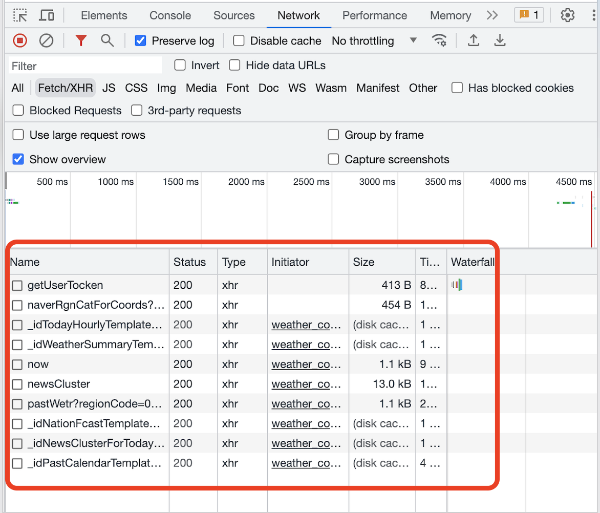 네트워크 통신이 발생하면서 개발자툴 밑에 뭔가가 생겼습니다