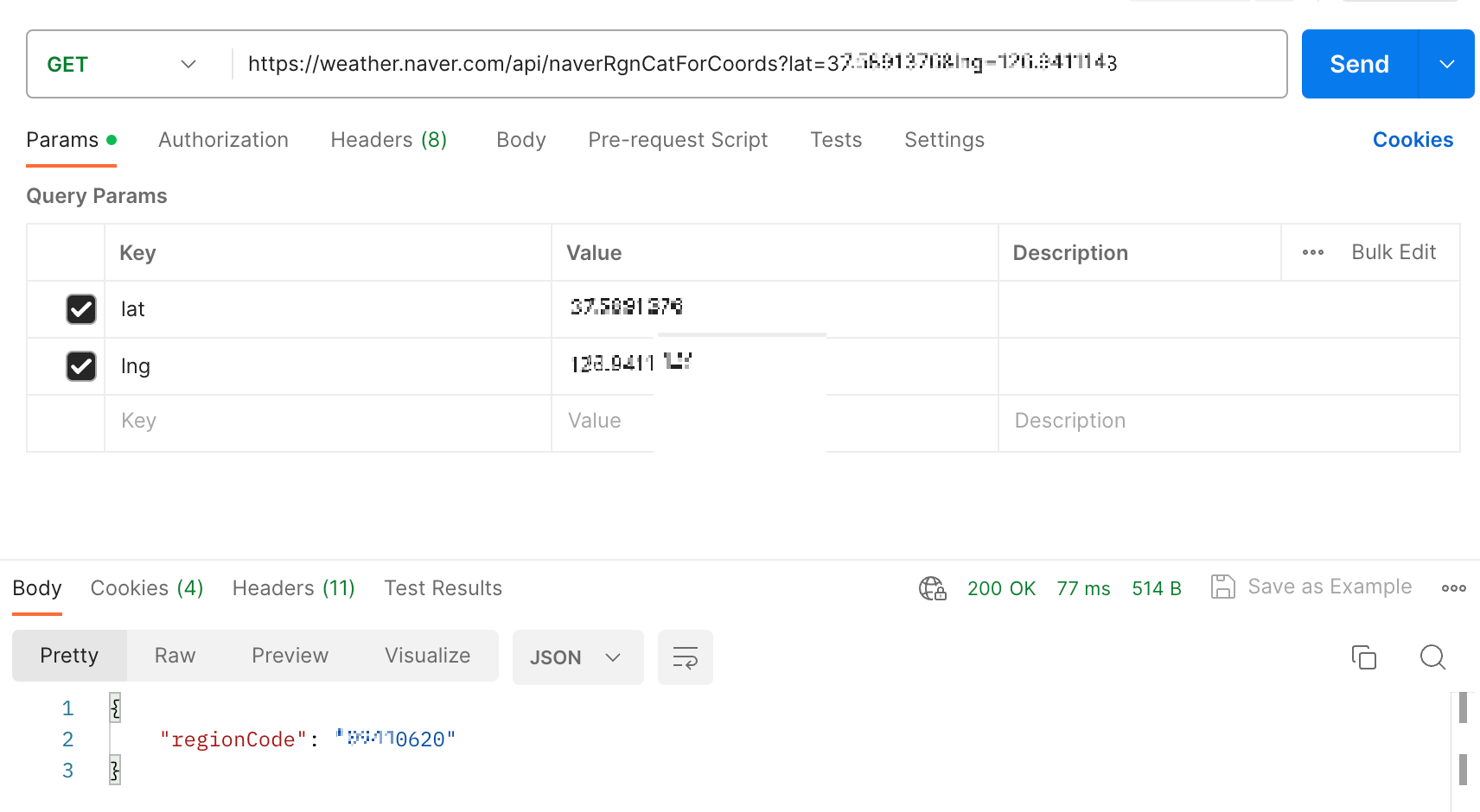 포스트맨에서 Body값을 확인해보니 regionCode값을 획득했습니다!