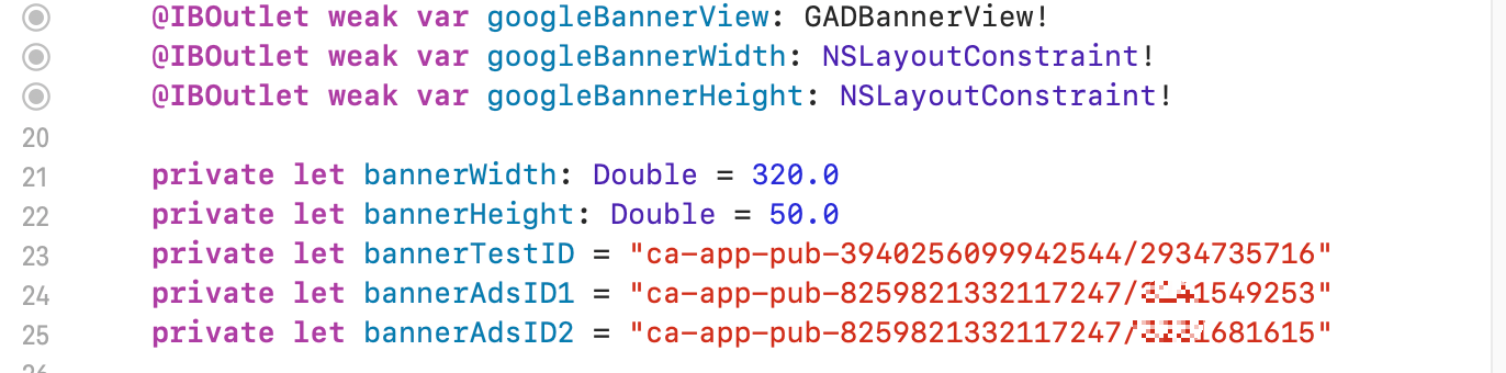 저는 나중에 배너의 크기를 변경해서 사용할 예정이라 GadBannerView의 Width와 Height 제약을 IBOutlet으로 만들어줬습니다.
