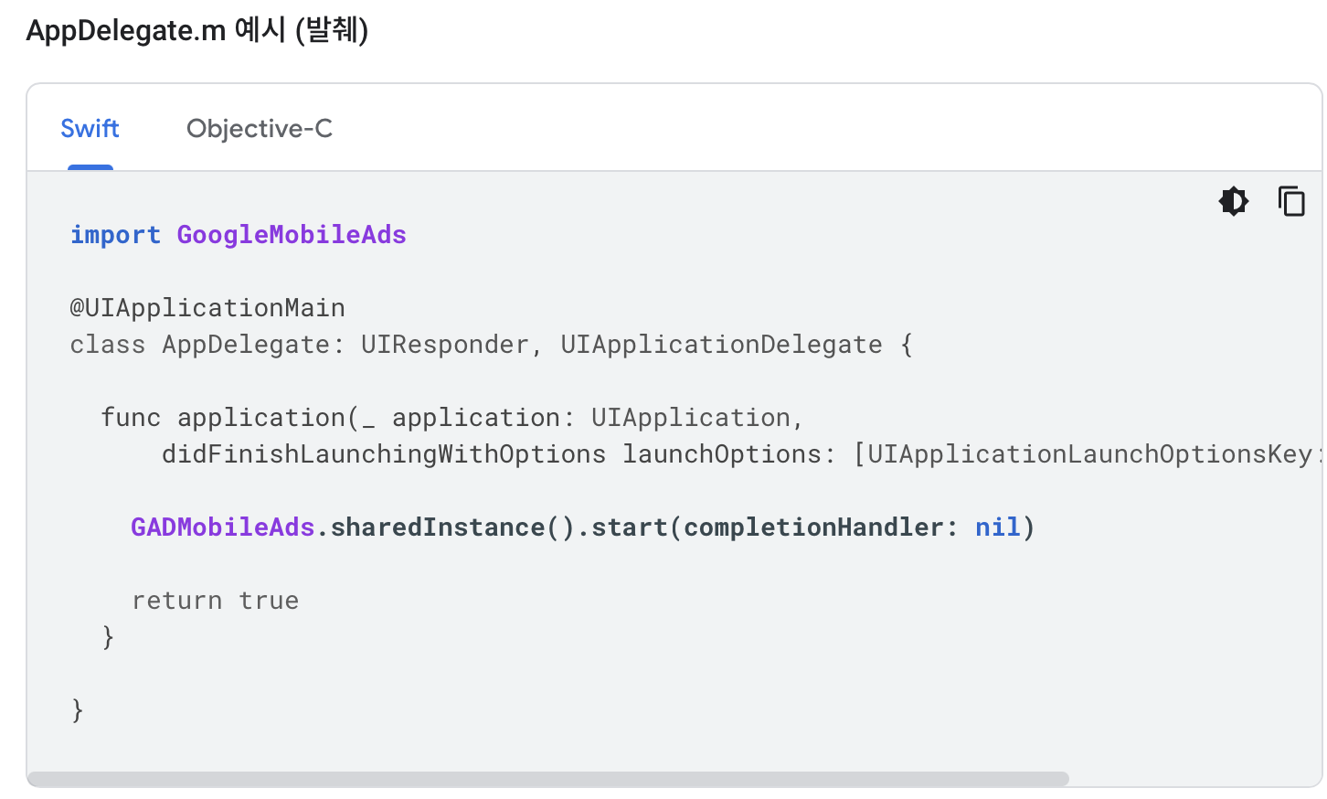 광고를 로드하기 전에 GADMobileAds.sharedInstance에서 startWithCompletionHandler: 메서드를 호출합니다. 그러면 SDK가 초기화되고 초기화가 완료된 후 (또는 30초의 제한 시간이 경과한 후에) 완료 핸들러를 다시 호출합니다. 이 작업은 앱 실행 시 한 번만 하는 것이 좋습니다. startWithCompletionHandler:를 최대한 빨리 호출해야 합니다.
