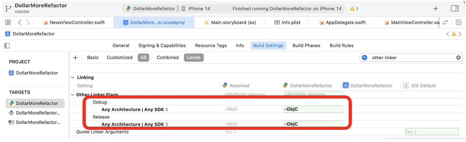 저는 Release 만 -ObjC(앞에 O와 뒤에 C는 대문자입니다)를 등록해줬는데 오류가 발생했습니다.