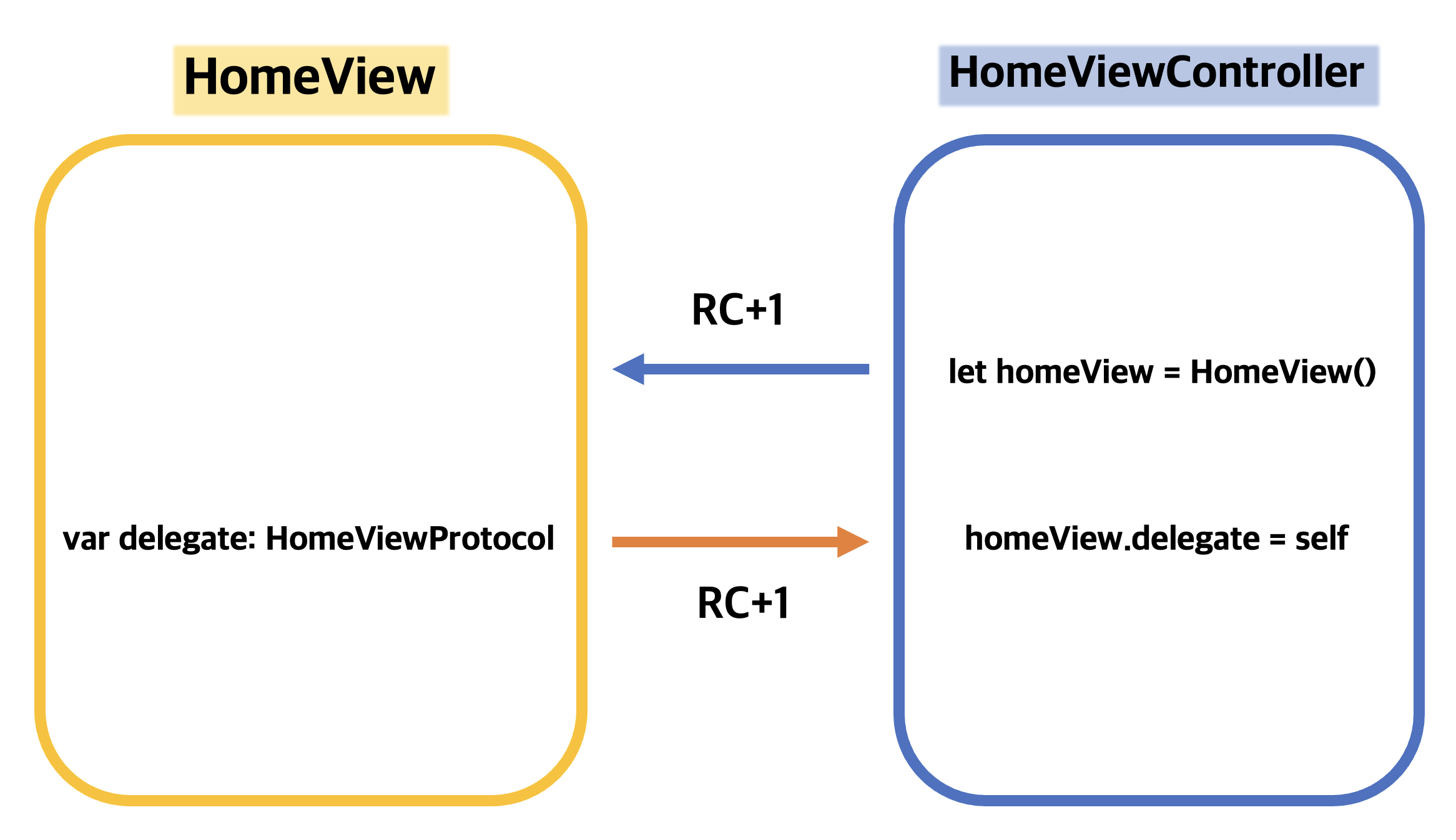 HomeViewController와 HomeView가 서로를 강하게 가리키면서 강한 순환참조 사이클이 발생한 것입니다.