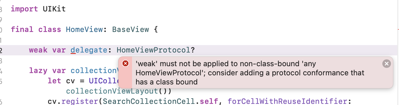 HomeViewProtocol에 클래스 제약 조건이 없기 때문에 weak 키워드를 사용할 수 없다고 합니다.