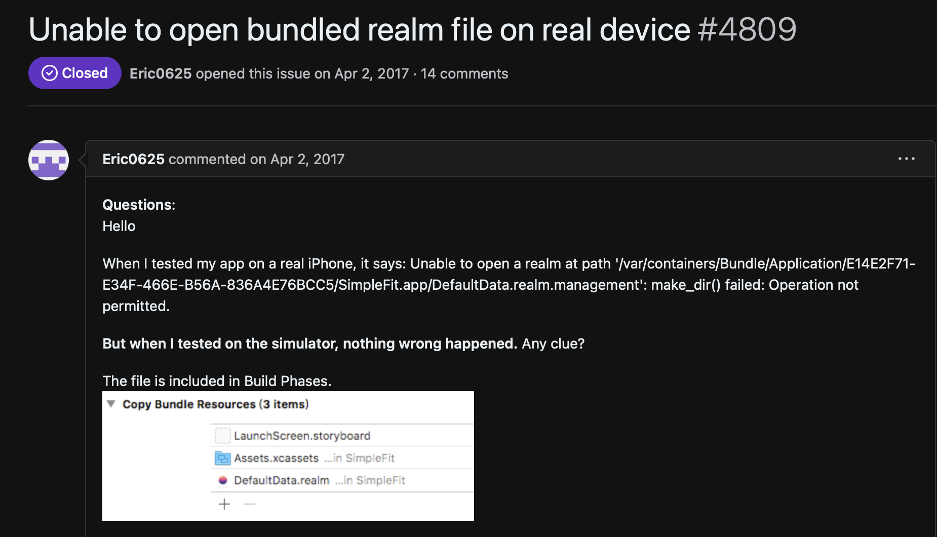 실제 기기에서는 번들에 있는 Realm 파일에 접근할 수 없어서 파일 접근 에러가 발생합니다.