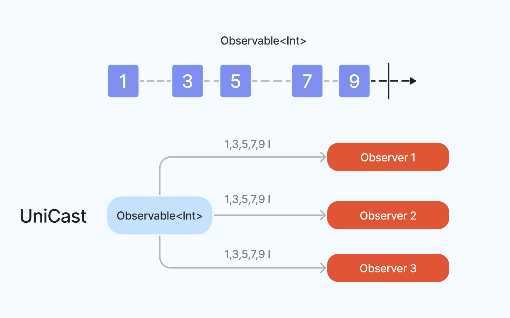Observable은 하나의 Observer에게만 이벤트를 전달하는 UniCast 방식입니다.
