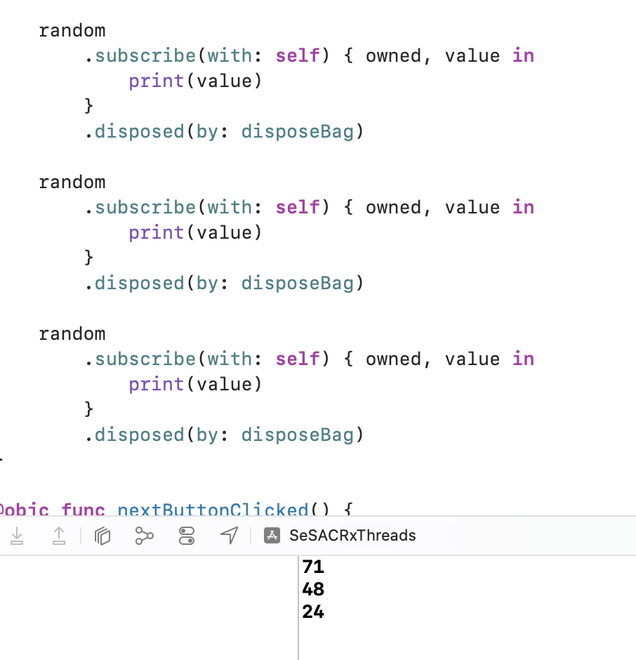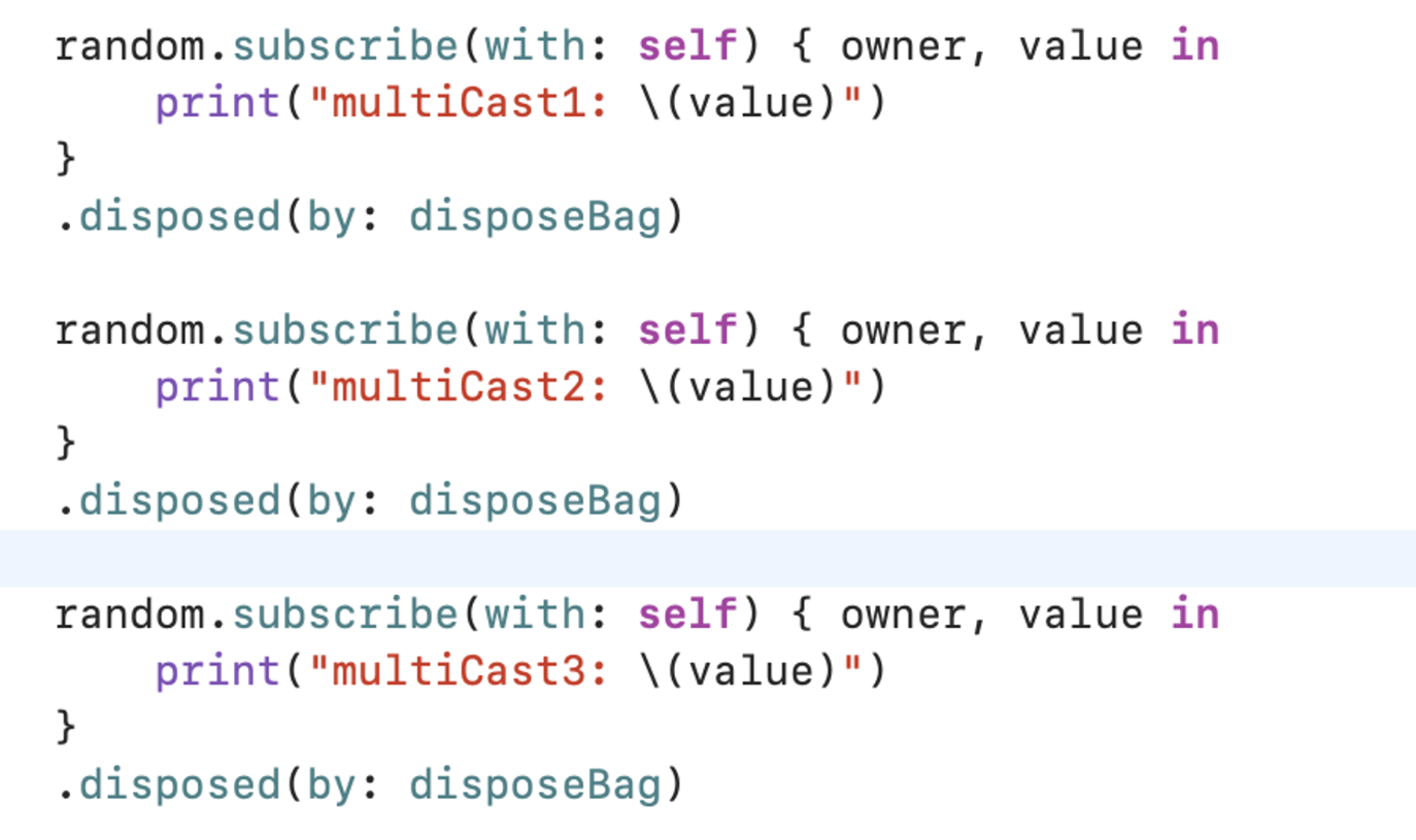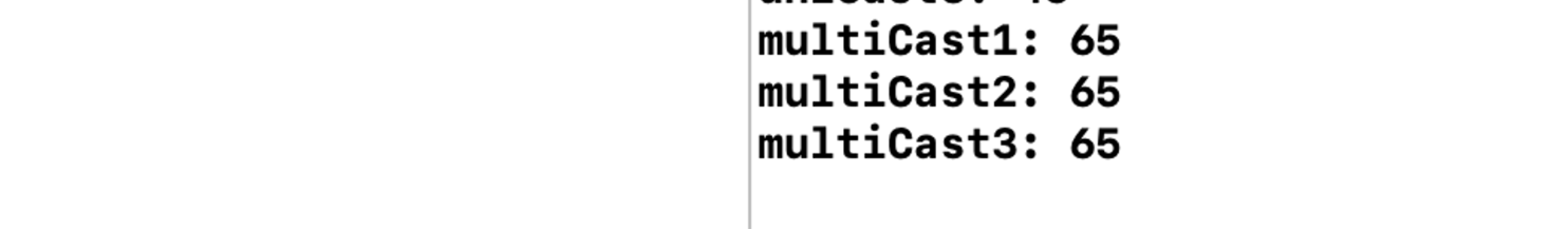 3개의 다른 Observer가 구독하여 값을 출력하면, 각각 다른 값을 수신하는 것을 확인할 수 있습니다.