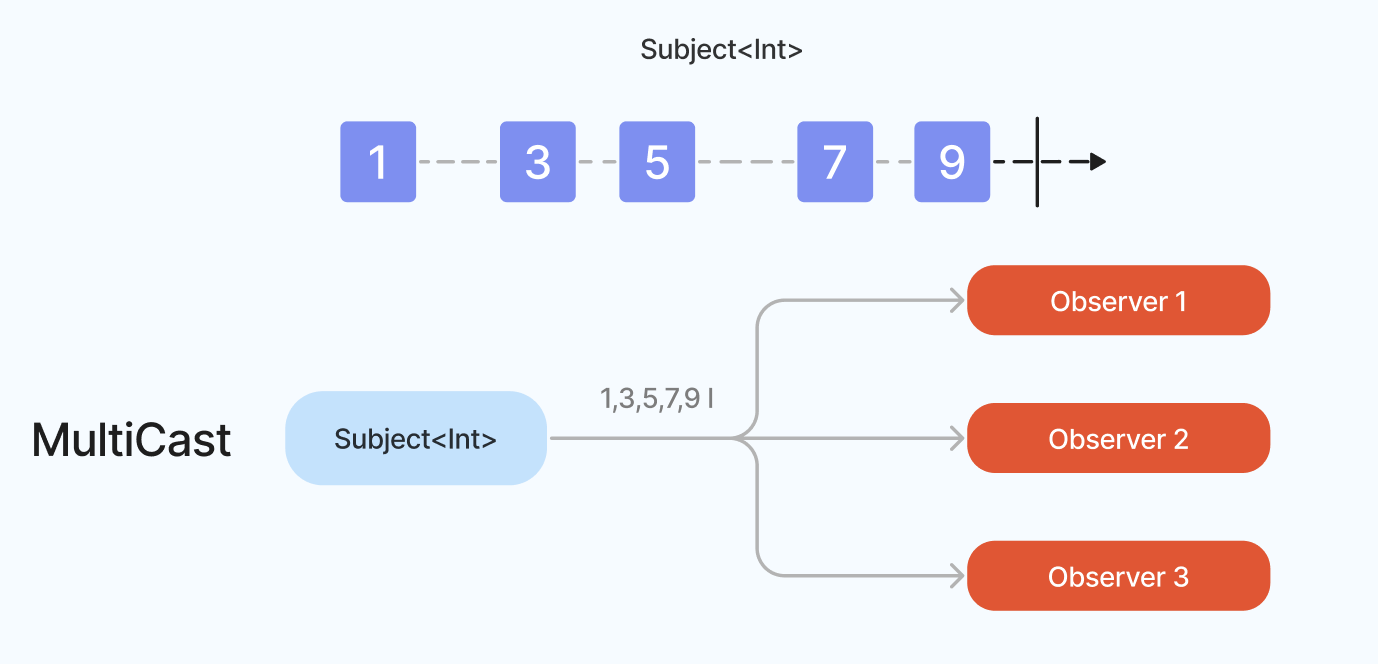 반면, Subject는 Observable과 유사하지만, 하나의 스트림을 공유하는 MultiCast 방식입니다.