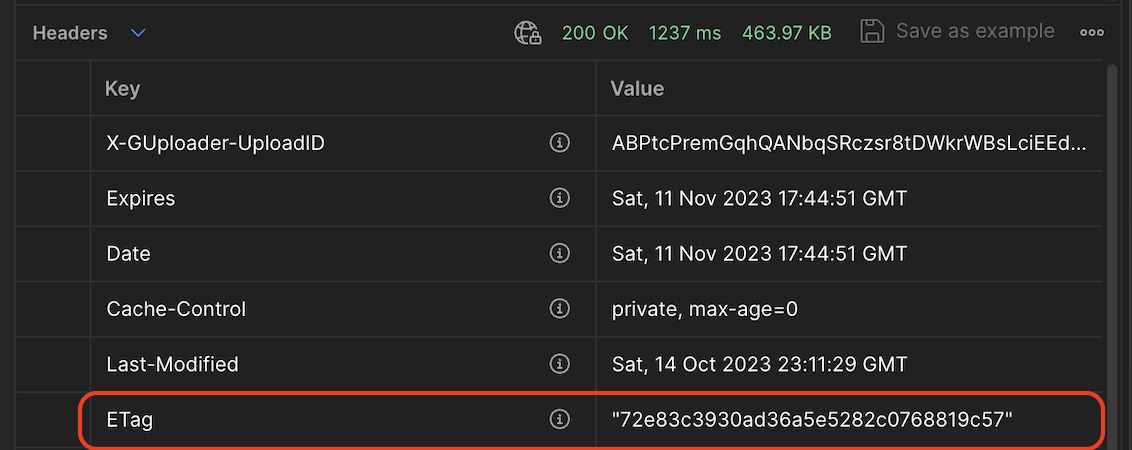서버의 ETag와 요청한 ETag의 값이 일치하지 않으면 StatusCode로 200(수정됨) OK와 함께 HTTP 바디값을 받을 수 있습니다.