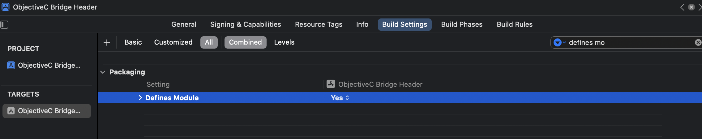 Targets → Build Setting → Defines Module의 값을 No → Yes로 변경해주면