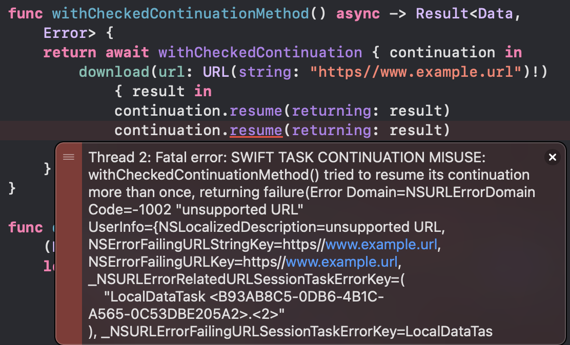 Thread 2: Fatal error: SWIFT TASK CONTINUATION MISUSE: withCheckedContinuationMethod() tried to resume its continuation more than once,