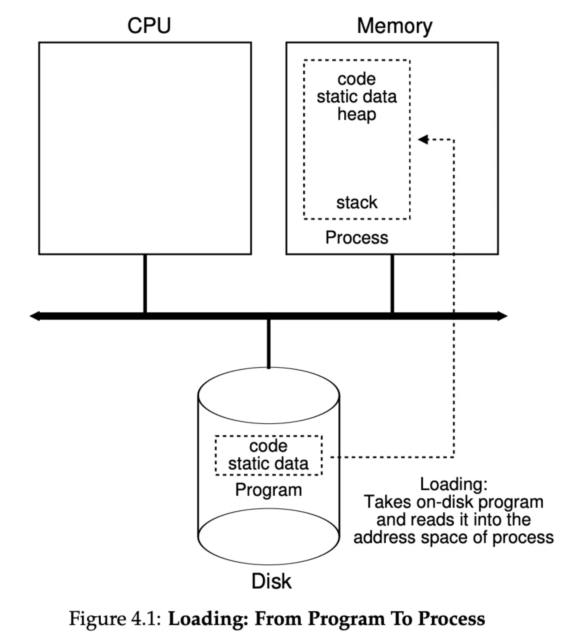 • 프로그램은 처음에는 디스크에 저장됩니다. 디스크에는 프로그램의 코드와 정적 데이터(static data)가 포함되어 있습니다.