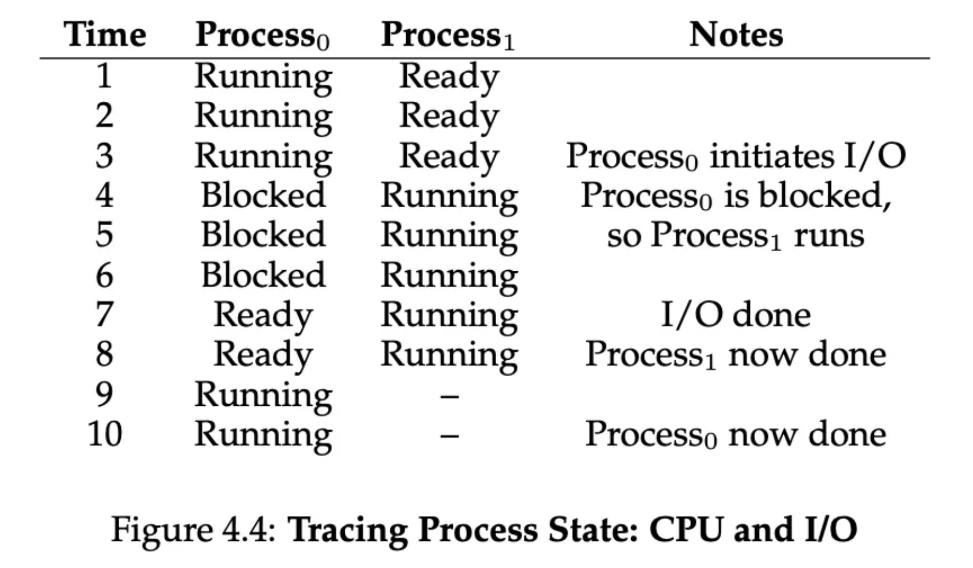 다음 표는 CPU와 I/O를 사용하는 프로세스의 상태 변화를 시간 순서대로 나타냅니다.