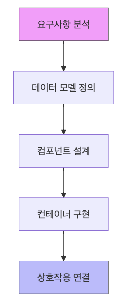 - 구성: 컴포넌트 조합, 레이아웃 설정, 이벤트 핸들러 연결